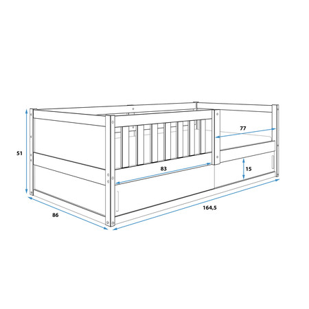 Postel obsahuje ochrannou zábranu. Díky praktickému úložnému prostoru vyřešíte problémy s uschováním všech malých nezbytností. S ohledem na děti je veškerý sortiment vyroben ekologicky. Je tedy vyloučeno při kontaktu dítěte s nábytkem požití toxických nebo zdraví škodlivých látek.