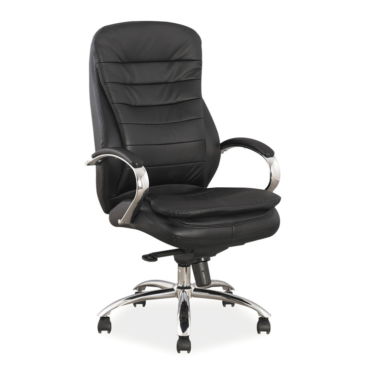 Moderní otáčecí kancelářské křeslo s možností nastavení výšky sedadla. Podstavec a opěradla jsou z kovu, čalounění je vyrobené z prvé kůže v černé barvě. Výška sedadla je v rozmezí 43 - 49 cm, celková výška je 116 - 122 cm. Nosnost do 120 kg.