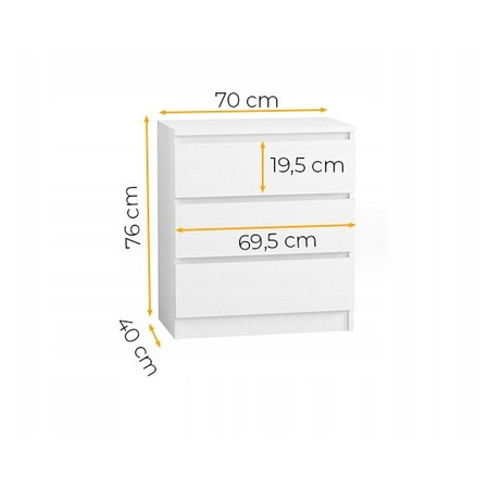 Komoda 70/3 je vyrobena z kvalitních materiálů. Univerzální vzhled splní očekávání všech, kteří oceňují kombinaci jednoduchosti a elegance. Bezúchytková čela zásuvek zajišťují pohodlné používání, a zdůrazňují modernistický charakter interiéru.