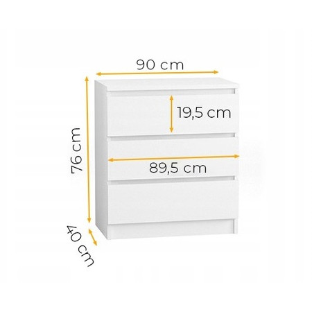 Komoda 90/3 je vyrobena z kvalitních materiálů. Univerzální vzhled splní očekávání všech, kteří oceňují kombinaci jednoduchosti a elegance. Bezúchytková čela zásuvek zajišťují pohodlné používání, a zdůrazňují modernistický charakter interiéru.