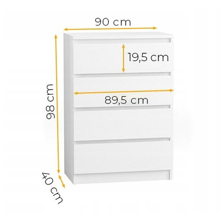 Komoda 90/4 je vyrobena z kvalitních materiálů. Univerzální vzhled splní očekávání všech, kteří oceňují kombinaci jednoduchosti a elegance. Bezúchytková čela zásuvek zajišťují pohodlné používání, a zdůrazňují modernistický charakter interiéru.