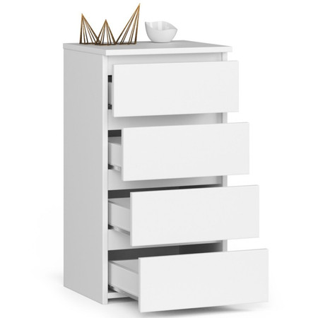 Jednoduchá a moderní komoda. Je vyrobená z pevné laminované desky, která je odolná proti oděru a poškození. Univerzální vzhled splní očekávání každého, kdo ocení kombinaci jednoduchosti a elegance. Bezúchytková čela zásuvek zajišťují pohodlné používání.