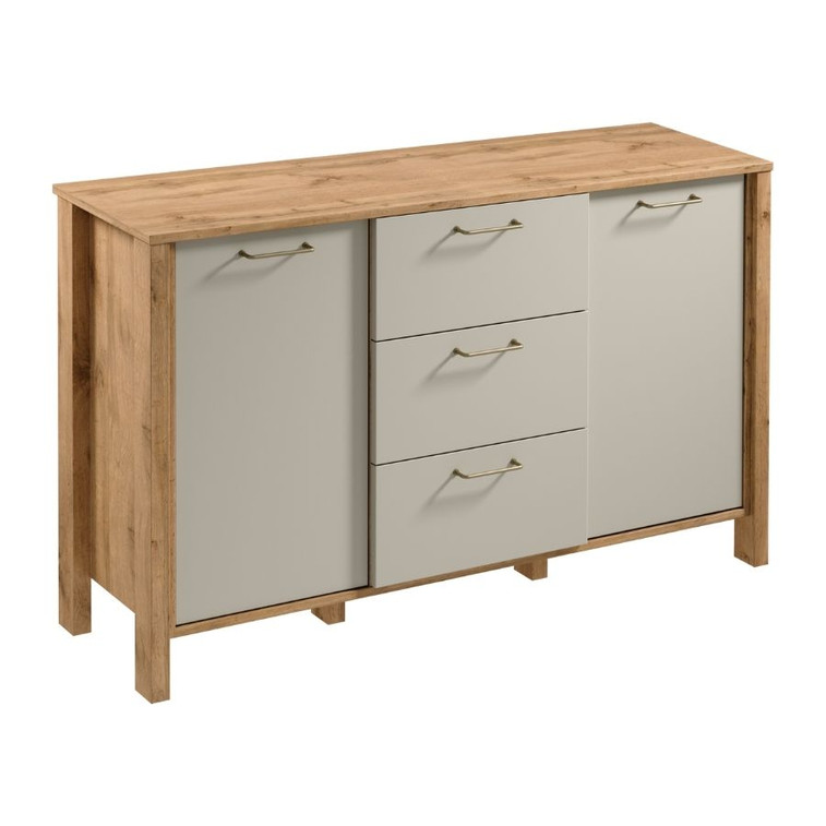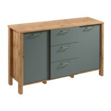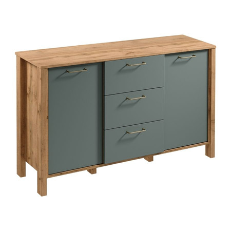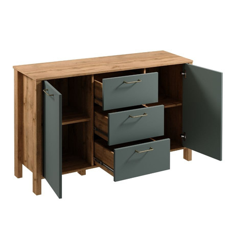 Komoda K2D3S se skvěle hodí na drobnosti a dokumenty. Zásuvky mají funkci plného výsuvu, což výrazně usnadňuje přístup k předmětům uvnitř. Dvě prostorné skříně s poličkou nabízející další úložný prostor. Vysoké nohy umožňují snadný přístup. Kovové rukojeti v matně zlaté barvě dodávají eleganci. Přírodní barvy teplého dekoru dub Wotan na korpusu nábytku v kombinaci s jednobarevnou béžovou nebo zelenou na výběr dělají kolekci přirozeně krásnou.