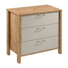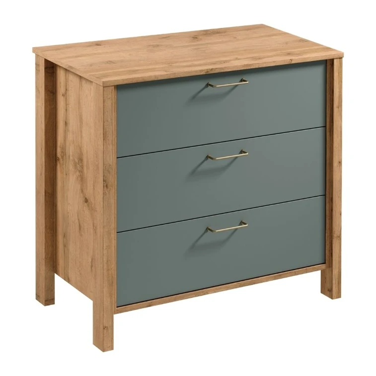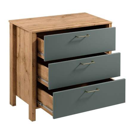 Komoda K3S se třemi prostornými, plnovýsuvnými zásuvkami, což výrazně usnadňuje přístup k věcem uvnitř. Povrch pracovní desky umožňuje vystavit dekorace. Kovové rukojeti v matně zlaté barvě dodávají eleganci. Přírodní barvy teplého dekoru dub Wotan na korpusu nábytku v kombinaci s jednobarevnou béžovou nebo zelenou na výběr dělají kolekci přirozeně krásnou.