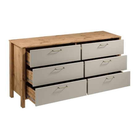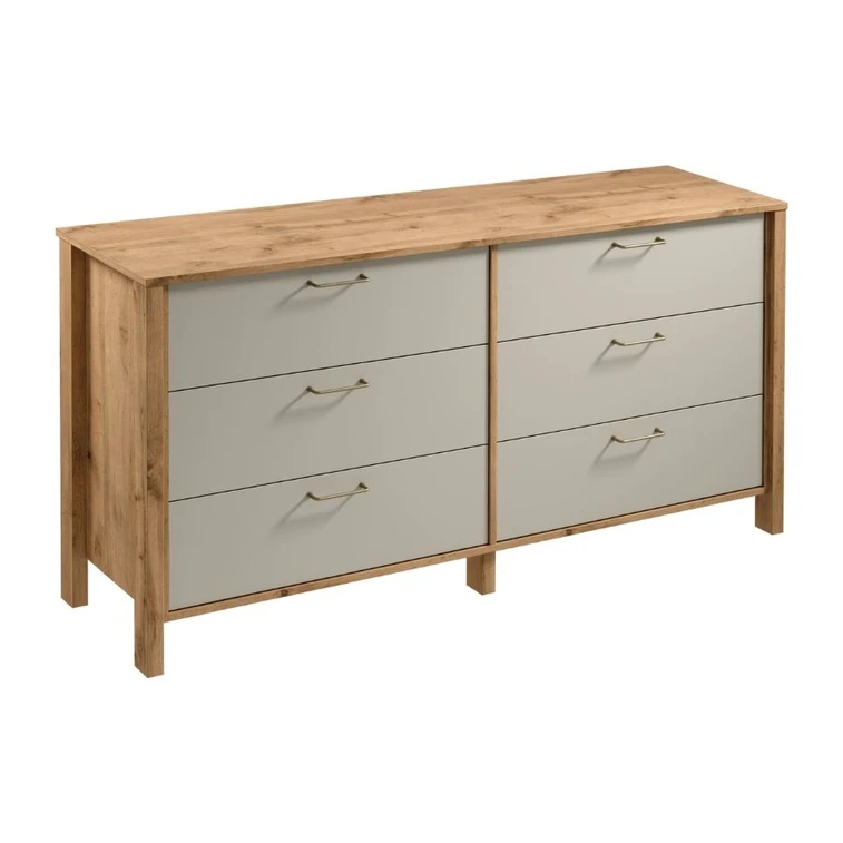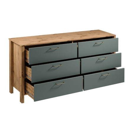 Komoda K6S se šesti prostornými, plnovýsuvnými zásuvkami, což výrazně usnadňuje přístup k věcem uvnitř. Povrch pracovní desky umožňuje vystavit dekorace. Kovové rukojeti v matně zlaté barvě dodávají eleganci. Přírodní barvy teplého dekoru dub Wotan na korpusu nábytku v kombinaci s jednobarevnou béžovou nebo zelenou na výběr dělají kolekci přirozeně krásnou.