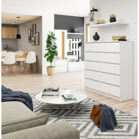 Jednoduchá a moderní komoda K120 10SZ. Je vyrobená z pevné laminované desky, která je odolná proti oděru a poškození. Univerzální vzhled splní očekávání každého, kdo ocení kombinaci jednoduchosti a elegance. Bezúchytková čela zásuvek zajišťují pohodlné používání.