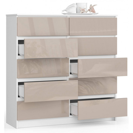 Jednoduchá a moderní komoda K120 10SZ. Je vyrobená z pevné laminované desky, která je odolná proti oděru a poškození. Univerzální vzhled splní očekávání každého, kdo ocení kombinaci jednoduchosti a elegance. Bezúchytková čela zásuvek zajišťují pohodlné používání.