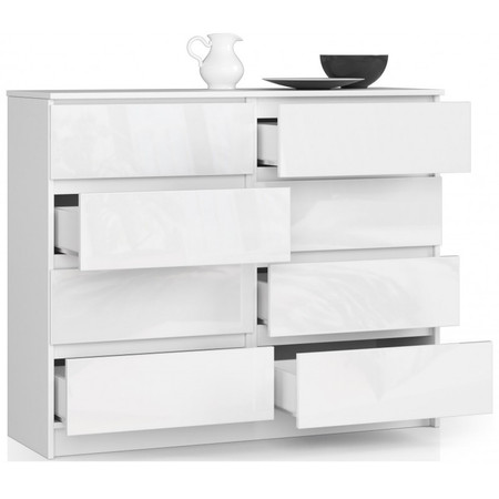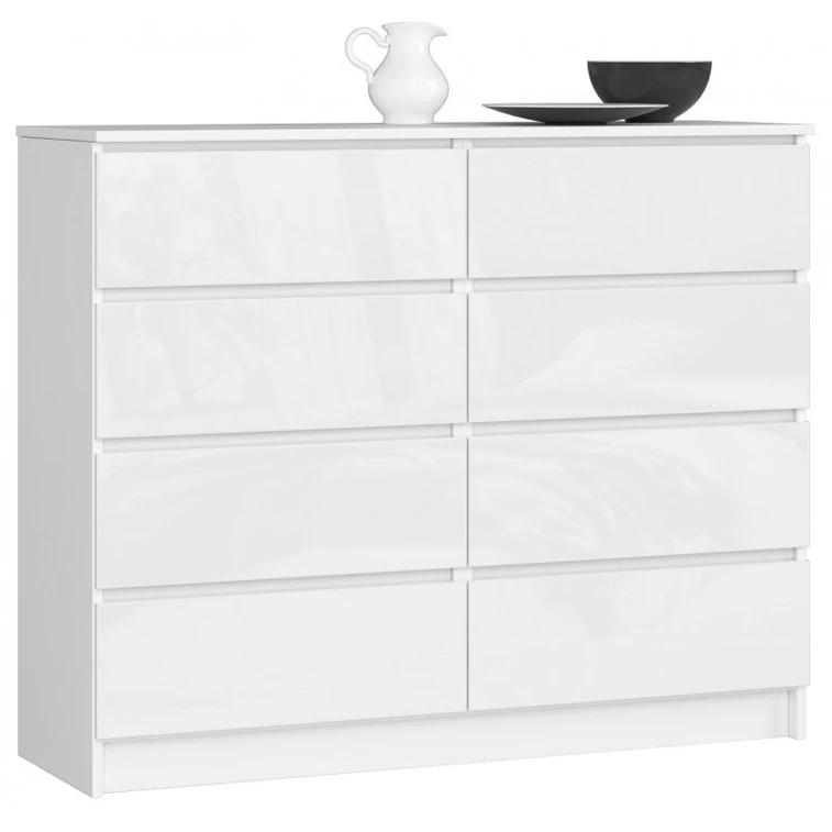Jednoduchá a moderní komoda K120 8SZ. Je vyrobená z pevné laminované desky, která je odolná proti oděru a poškození. Univerzální vzhled splní očekávání každého, kdo ocení kombinaci jednoduchosti a elegance. Bezúchytková čela zásuvek zajišťují pohodlné používání.