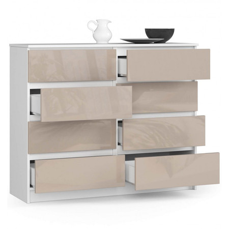 Jednoduchá a moderní komoda K120 8SZ. Je vyrobená z pevné laminované desky, která je odolná proti oděru a poškození. Univerzální vzhled splní očekávání každého, kdo ocení kombinaci jednoduchosti a elegance. Bezúchytková čela zásuvek zajišťují pohodlné používání.