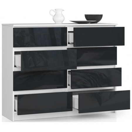 Jednoduchá a moderní komoda K120 8SZ. Je vyrobená z pevné laminované desky, která je odolná proti oděru a poškození. Univerzální vzhled splní očekávání každého, kdo ocení kombinaci jednoduchosti a elegance. Bezúchytková čela zásuvek zajišťují pohodlné používání.