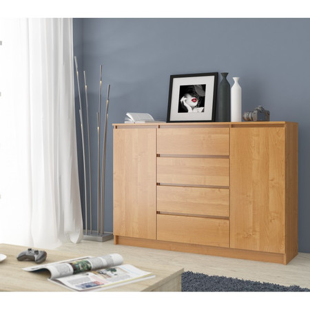 Jednoduchá a moderní komoda K140 2D4SZ. Je vyrobená z pevné laminované desky, která je odolná proti oděru a poškození. Univerzální vzhled splní očekávání každého, kdo ocení kombinaci jednoduchosti a elegance. Bezúchytková čela zásuvek zajišťují pohodlné používání.