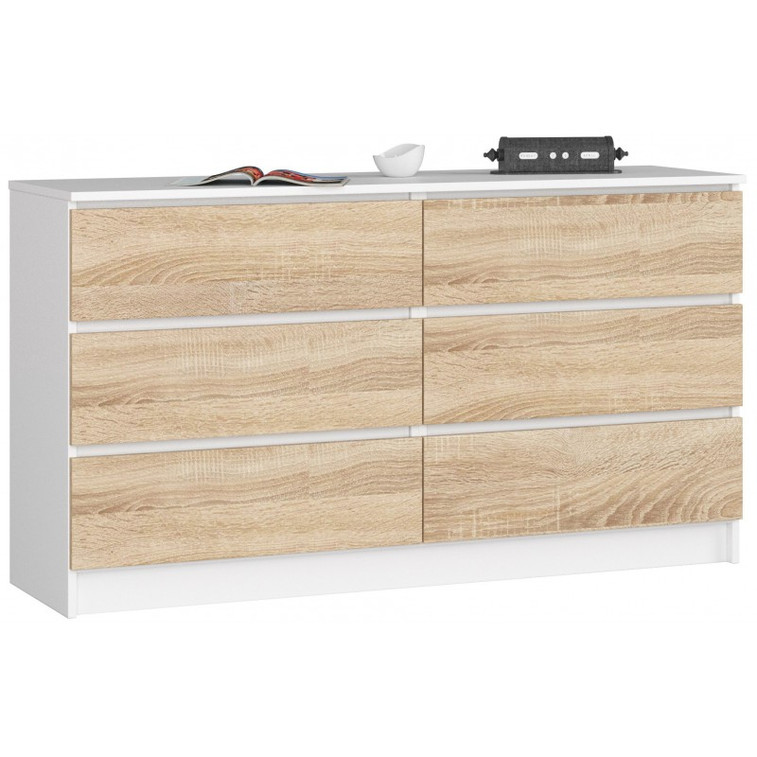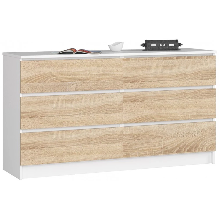 Jednoduchá a moderní komoda K140 6SZ. Je vyrobená z pevné laminované desky, která je odolná proti oděru a poškození. Univerzální vzhled splní očekávání každého, kdo ocení kombinaci jednoduchosti a elegance. Bezúchytková čela zásuvek zajišťují pohodlné používání.