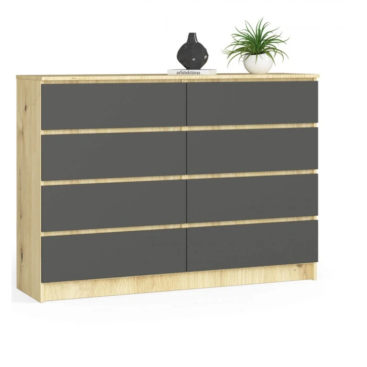 Jednoduchá a moderní komoda K140 8SZ. Je vyrobená z pevné laminované desky, která je odolná proti oděru a poškození. Univerzální vzhled splní očekávání každého, kdo ocení kombinaci jednoduchosti a elegance.