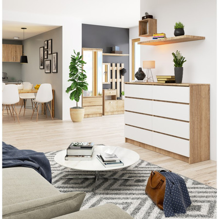 Jednoduchá a moderní komoda K140 8SZ. Je vyrobená z pevné laminované desky, která je odolná proti oděru a poškození. Univerzální vzhled splní očekávání každého, kdo ocení kombinaci jednoduchosti a elegance. Bezúchytková čela zásuvek zajišťují pohodlné používání.