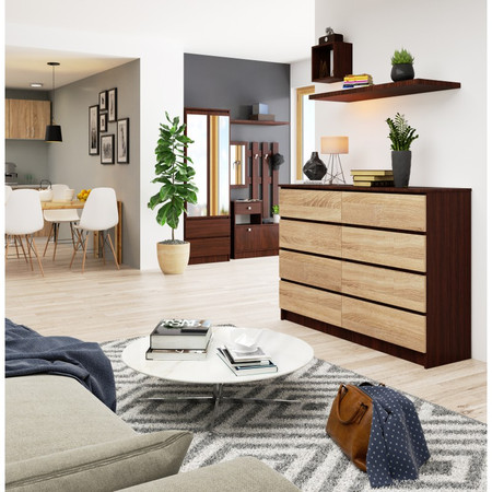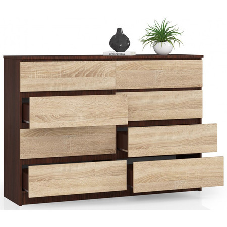 Jednoduchá a moderní komoda K140 8SZ. Je vyrobená z pevné laminované desky, která je odolná proti oděru a poškození. Univerzální vzhled splní očekávání každého, kdo ocení kombinaci jednoduchosti a elegance. Bezúchytková čela zásuvek zajišťují pohodlné používání.