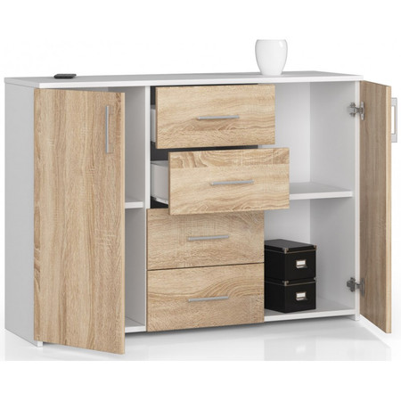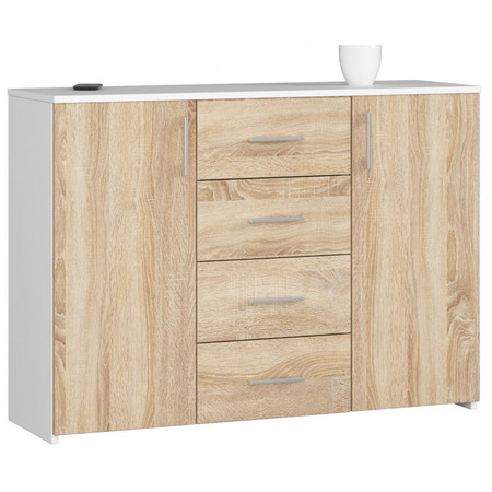 Jednoduchá a moderní komoda K45. Je vyrobená z pevné laminované desky, která je odolná proti oděru a poškození. Univerzální vzhled splní očekávání každého, kdo ocení kombinaci jednoduchosti a elegance.