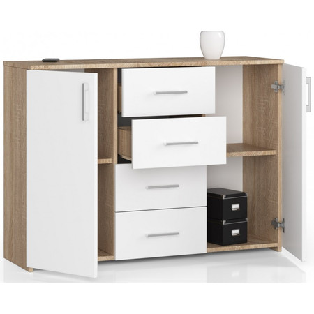 Jednoduchá a moderní komoda K45. Je vyrobená z pevné laminované desky, která je odolná proti oděru a poškození. Univerzální vzhled splní očekávání každého, kdo ocení kombinaci jednoduchosti a elegance.