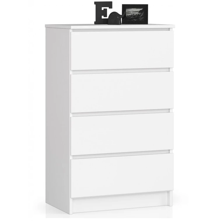 Jednoduchá a moderní komoda K60 4SZ. Je vyrobená z pevné laminované desky, která je odolná proti oděru a poškození. Univerzální vzhled splní očekávání každého, kdo ocení kombinaci jednoduchosti a elegance. Bezúchytková čela zásuvek zajišťují pohodlné používání.