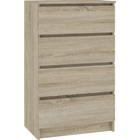 Jednoduchá a moderní komoda K60 4SZ. Je vyrobená z pevné laminované desky, která je odolná proti oděru a poškození. Univerzální vzhled splní očekávání každého, kdo ocení kombinaci jednoduchosti a elegance. Bezúchytková čela zásuvek zajišťují pohodlné používání.