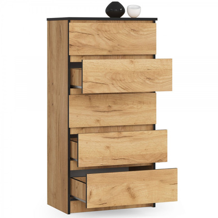 Komoda K 60 5SZ má moderní vzhled. Je velká, prostorná a funkční. Komoda je oblíbeným kusem nábytku, zejména v místnostech, jako je obývací pokoj, nebo ložnice. Komoda má jednoduchý tvar a univerzální charakter, takže se skvěle hodí do místností, s různými dekory a uspořádáními.
