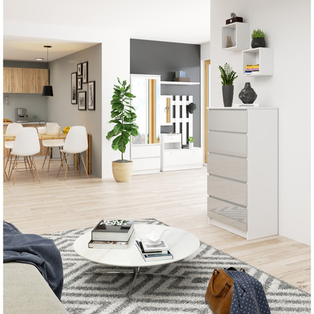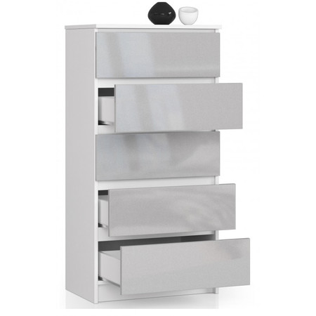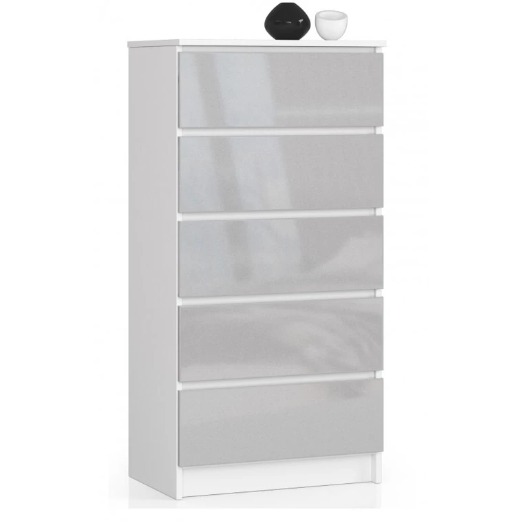 Jednoduchá a moderní komoda K60 5SZ. Je vyrobená z pevné laminované desky, která je odolná proti oděru a poškození. Univerzální vzhled splní očekávání každého, kdo ocení kombinaci jednoduchosti a elegance. Bezúchytková čela zásuvek zajišťují pohodlné používání.