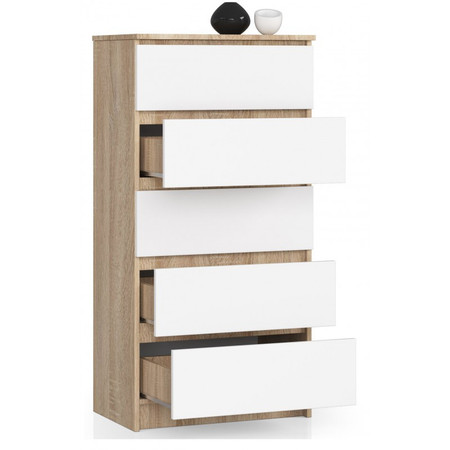 Jednoduchá a moderní komoda K60 5SZ. Je vyrobená z pevné laminované desky, která je odolná proti oděru a poškození. Univerzální vzhled splní očekávání každého, kdo ocení kombinaci jednoduchosti a elegance. Bezúchytková čela zásuvek zajišťují pohodlné používání.