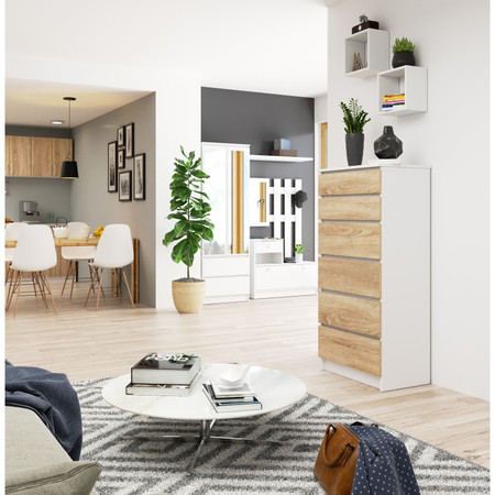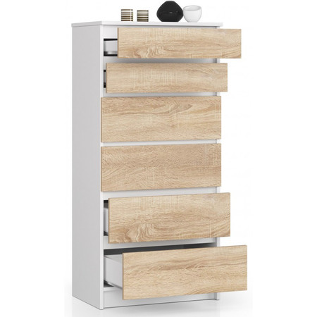 Jednoduchá a moderní komoda K60 6SZ. Je vyrobená z pevné laminované desky, která je odolná proti oděru a poškození. Univerzální vzhled splní očekávání každého, kdo ocení kombinaci jednoduchosti a elegance. Bezúchytková čela zásuvek zajišťují pohodlné používání.