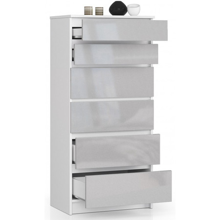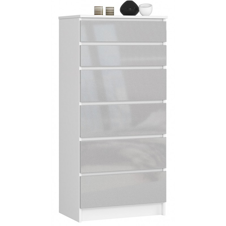 Jednoduchá a moderní komoda K60 6SZ. Je vyrobená z pevné laminované desky, která je odolná proti oděru a poškození. Univerzální vzhled splní očekávání každého, kdo ocení kombinaci jednoduchosti a elegance. Bezúchytková čela zásuvek zajišťují pohodlné používání.
