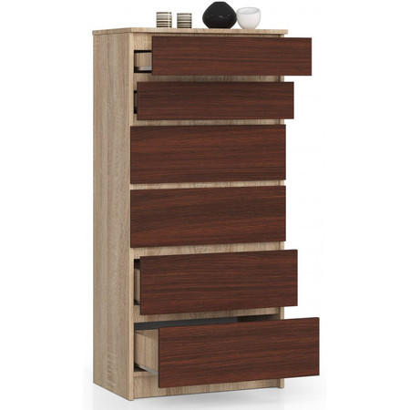 Jednoduchá a moderní komoda K60 6SZ. Je vyrobená z pevné laminované desky, která je odolná proti oděru a poškození. Univerzální vzhled splní očekávání každého, kdo ocení kombinaci jednoduchosti a elegance. Bezúchytková čela zásuvek zajišťují pohodlné používání.