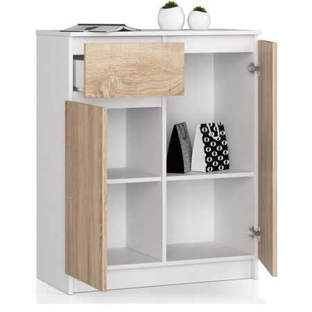 Jednoduchá a moderní komoda K80 2D1SZ. Je vyrobená z pevné laminované desky, která je odolná proti oděru a poškození. Univerzální vzhled splní očekávání každého, kdo ocení kombinaci jednoduchosti a elegance.