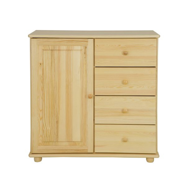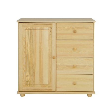 Kvalitní komoda KD100. Dřevěná kombinovaná komoda se 4 zásuvkami a dvířkami je vyrobena z masivní přírodní borovice a je povrchově upravená ekologickým lakováním. Zásuvky jsou dřevěné na kolečkových výsuvech. U dvířek jsou použity kvalitní kovové panty. Tato komoda se vyznačuje pečlivým zpracováním a dlouhou životností.