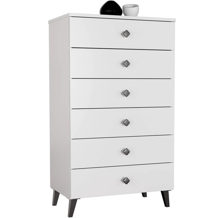 Moderní komoda se 6 prostornými zásuvkami. Vysoké plastové nohy umožňují snadný přístup pro vysavač.