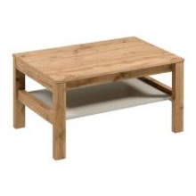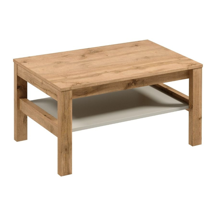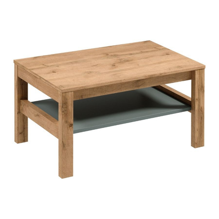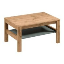 Konferenční stolek s policí na knihy nebo časopisy. Skvělý doplněk k celé kolekci Indigo. Přírodní barvy teplého dekoru dub Wotan na korpusu nábytku v kombinaci s jednobarevnou béžovou nebo zelenou na výběr dělají kolekci přirozeně krásnou.