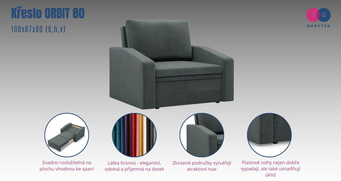Křeslo ORBIT 80 je moderní a stylový kus nábytku, který byl navržen s ohledem na lidi kteří oceňují pohodlí a funkčnost. Je vyrobeno z pevných, vysoce kvalitních materiálů. Nohy jsou vyrobeny z plastu. Součástí křesla je úložný prostor.
