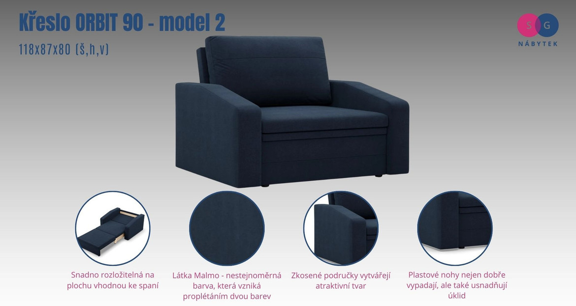 Křeslo ORBIT 90 je moderní a stylový kus nábytku, který byl navržen s ohledem na lidi kteří oceňují pohodlí a funkčnost. Je vyrobeno z pevných, vysoce kvalitních materiálů. Nohy jsou vyrobeny z plastu. Součástí křesla je úložný prostor.