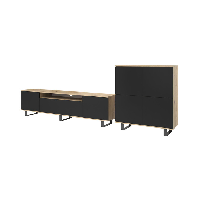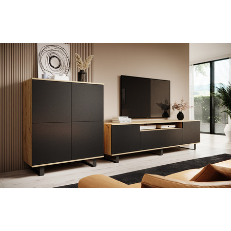 Obývací stěna Logan je příkladem moderní sestavy nábytku. Stěna je vyrobena z laminované desky se strukturou dřeva, která vypadá úžasně v každé místnosti. Jednotlivé části ze sestavy je možné umístit samostatně přesně tak, aby se stěna přizpůsobila Vaší místnosti a stala se funkční. Otevírání v systému "PUSH TO OPEN" - komoda je vybavena mechanismem, který po lehkém stlačení dvířka otevře, vysoká kvalita. Komodu i TV stolek lze postavit i bez kovové podnože, nebo zavěsit na stěnu.