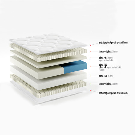 Pěna: Je vyrobena z vysoce kvalitní polyuretanové pěny T25 se zvýšenou pružností a pevností. T30 profilované pěny s masážními vlastnostmi. HR pěny, která vyniká tvarovou stálostí a vysokou elasticitou.