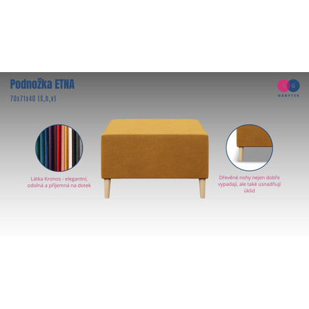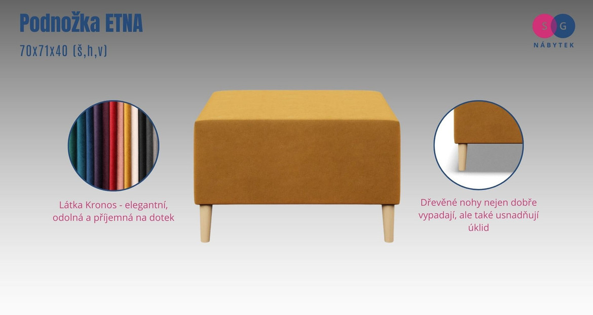 Kvalitní čalouněná podnožka Podnožka ETNA - Kronos 70x70 cm je vyrobena z pevných, vysoce kvalitních materiálů. Nohy jsou vyrobeny ze dřeva.