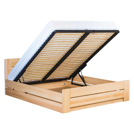 - Rám je umístěn na kovovém rámu, který se otevírá zepředu, namontovaný na plynových zvedácích, což umožňuje snadný přístup k nádobě na lůžkoviny umístěné pod postelí. Díky tomuto řešení se postel skvěle hodí do místností s omezeným prostorem.