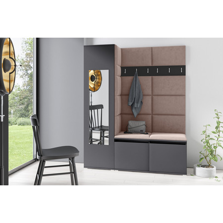 Předsíňová stěna AMI 14, je moderní a praktický prvek do vstupních prostor vašeho domu. Předsíňová stěna obsahuje patnáct čalouněných panelů, které se montují přímo na stěnu za pomoci lepidla. Potah botníku je tkanina TRINITY, která je měkká a příjemná na dotek. Jedná se o velurovou tkaninu. Předsíňová stěna se skládá z několika částí.