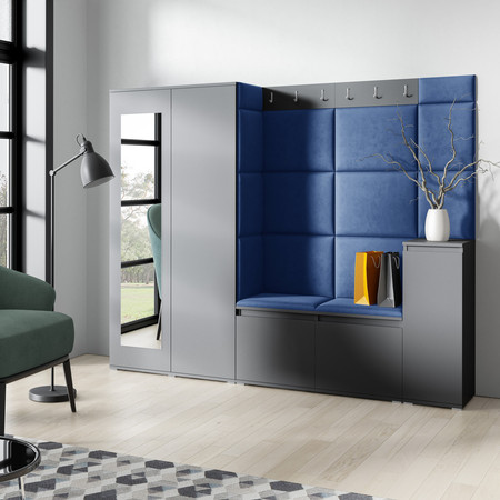 Předsíňová stěna AMI 27, je moderní a praktický prvek do vstupních prostor vašeho domu. Předsíňová stěna obsahuje patnáct čalouněných panelů, které se montují přímo na stěnu za pomoci lepidla. Potah botníku je tkanina TRINITY, která je měkká a příjemná na dotek. Jedná se o velurovou tkaninu. Předsíňová stěna se skládá z několika částí.