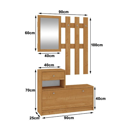 Věšák: Obsahuje tři věšáky na vaše oblečení. Výšku věšáku můžete nastavit dle vlastních potřeb. Hned vedle věšáku naleznete velké zrcadlo. Kde můžete zkontrolovat svůj finální look, před odchodem z domu. Pod věšákem se nachází šuplík a police, do kterých se vám vejdou vaše doplňky, nebo dekorace.