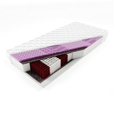 Velmi kvalitní 7 zónová matrace. Na obou stranách pokrytá pěnou. Každá pružina je umístěna v samostatné kapse z textilu. Kokosová vrstva, zpevňuje matraci a zabraňuje jejímu zborcení.