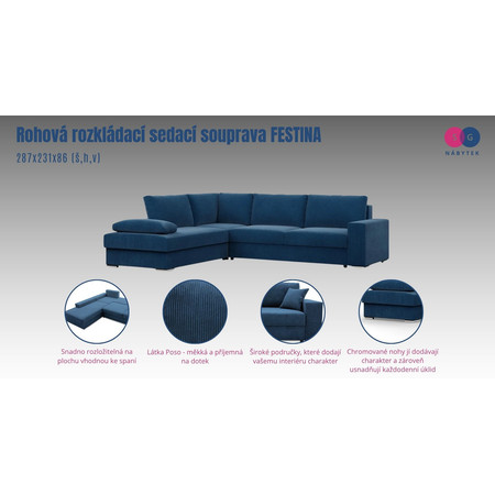 Pevná konstrukce ze dřeva a OSB desky. Potah z kvalitní látky POSO v mnoha moderních barevných odstínech. Snadné rozkládání na lůžkovou podobu. Moderní design vhodný do všech současných interiérů.