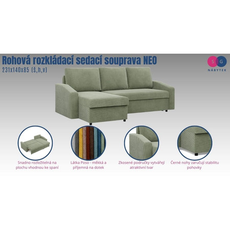 Sedací souprava NEO je moderní a stylový kus nábytku, který byl navržen s ohledem na lidi kteří oceňují pohodlí a funkčnost. Je vyrobena z pevných, vysoce kvalitních materiálů. Nohy jsou vyrobeny z plastu.