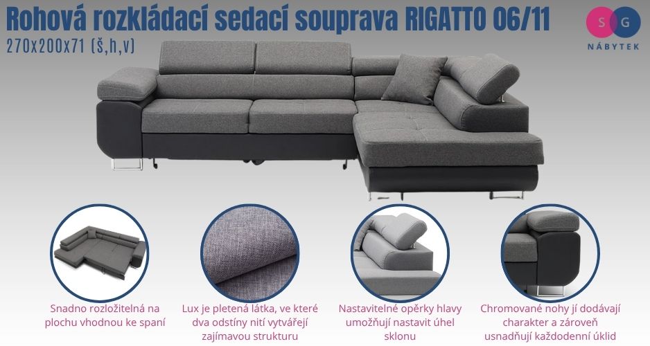 Rohová rozkládací sedací souprava Rigatto 06/11. Pevná konstrukce ze dřeva a OSB desky. Potah z kvalitní eko-kůže a tkaniny. Nastavitelné opěrky hlavy umožňují nastavit úhel sklonu ve vztahu ke krku a hlavě uživatele, což poskytuje dodatečnou podporu a zároveň maximální pohodlí . Pochromované efektní nožičky usnadní úklid a systém rozkládání typu delfín rychle a snadno promění sedací soupravu na lůžko. Moderní design vhodný do všech současných interiérů.