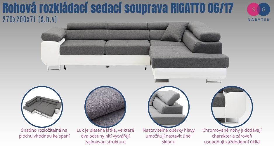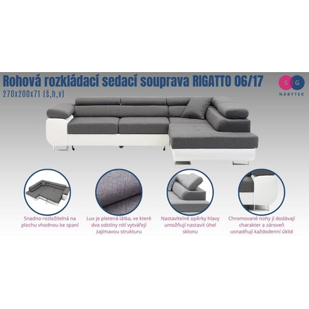 Rohová rozkládací sedací souprava Rigatto 06/17. Pevná konstrukce ze dřeva a OSB desky. Potah z kvalitní eko-kůže a tkaniny. Nastavitelné opěrky hlavy umožňují nastavit úhel sklonu ve vztahu ke krku a hlavě uživatele, což poskytuje dodatečnou podporu a zároveň maximální pohodlí .Pochromované efektní nožičky usnadní úklid a systém rozkládání typu delfín rychle a snadno promění sedací soupravu na lůžko. Moderní design vhodný do všech současných interiérů.