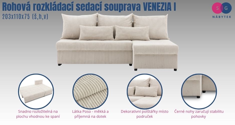 - Rohová sedací souprava Venezia je univerzálním kusem nábytku. Koupíte si kus nábytku a při první montáži se rozhodnete, jakou stranu si vyberete.
