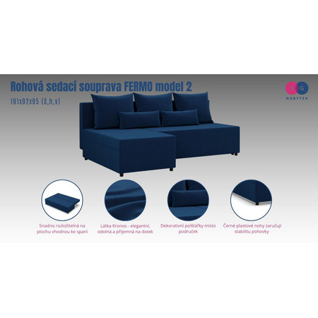 Pevná konstrukce ze dřeva a OSB desky. Potah z kvalitní látky v mnoha moderních barevných odstínech. Snadné rozkládání sedací soupravy na lůžkovou podobu. Moderní design vhodný do všech současných interiérů.