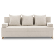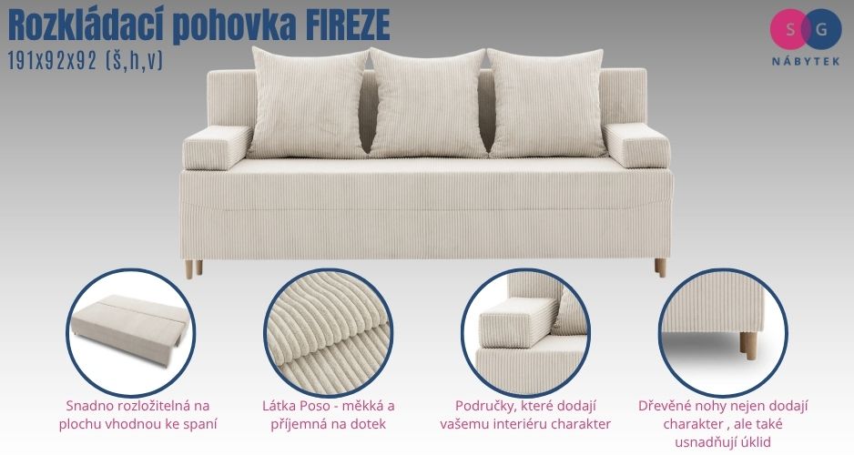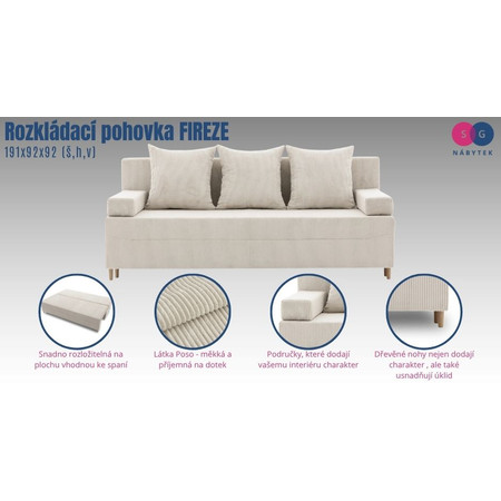 Pevná konstrukce ze dřeva a OSB desky. Potah z kvalitní látky Poso v moderních barevných odstínech. Snadné rozkládání pohovky na lůžkovou podobu. Moderní skandinávský design vhodný do všech současných interiérů. Součástí pohovky je úložný prostor.